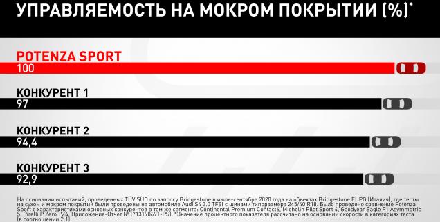 2На основании испытаний, проведенных TÜV SÜD по запросу Bridgestone в июле-сентябре 2020 года на объектах Bridgestone EUPG (Италия), где тесты на сухом и мокром покрытии были проведены на автомобиле Audi S4 3.0 TFSI с шинами типоразмера 245/40 R18. Было проведено сравнение Potenza Sport с характеристиками основных конкурентов в том же сегменте: Continental Premium Contact6, Michelin Pilot Sport 4, Goodyear Eagle F1 Asymmetric 5, Pirelli P Zero PZ4. Приложение-Отчет № [713190691-PS].